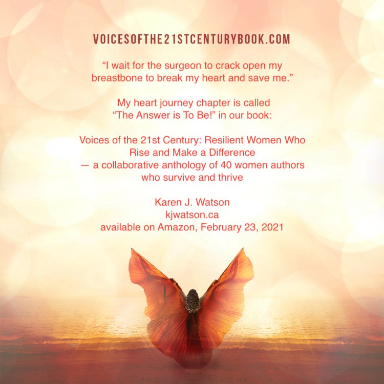 2021, VOICES4 BOOK free to borrow at the Ottawa Public LIBRARY. As part of making my heart story available in Voices of the 21st Century: Resilient Women Who Rise and Make a Difference (2021, WSA, NY, NY)