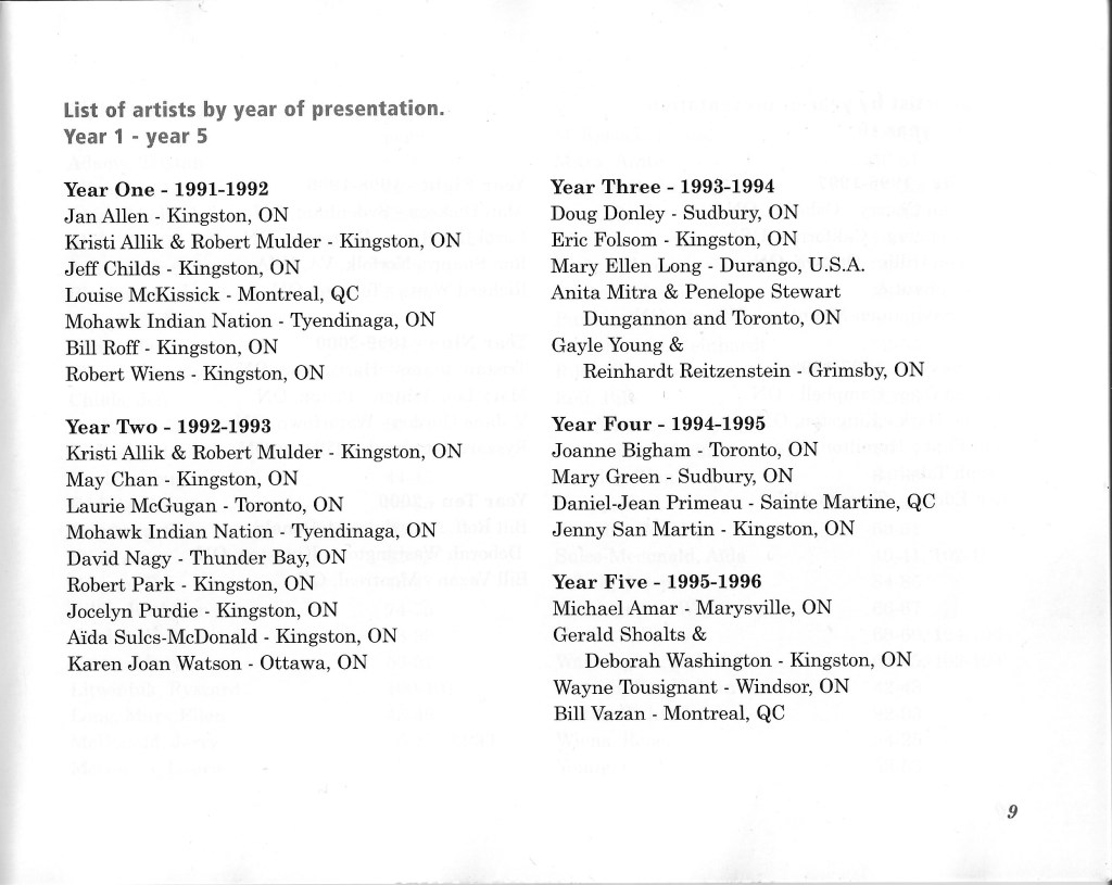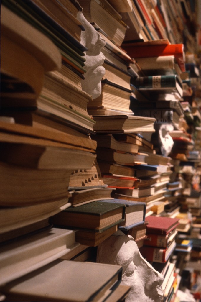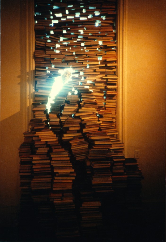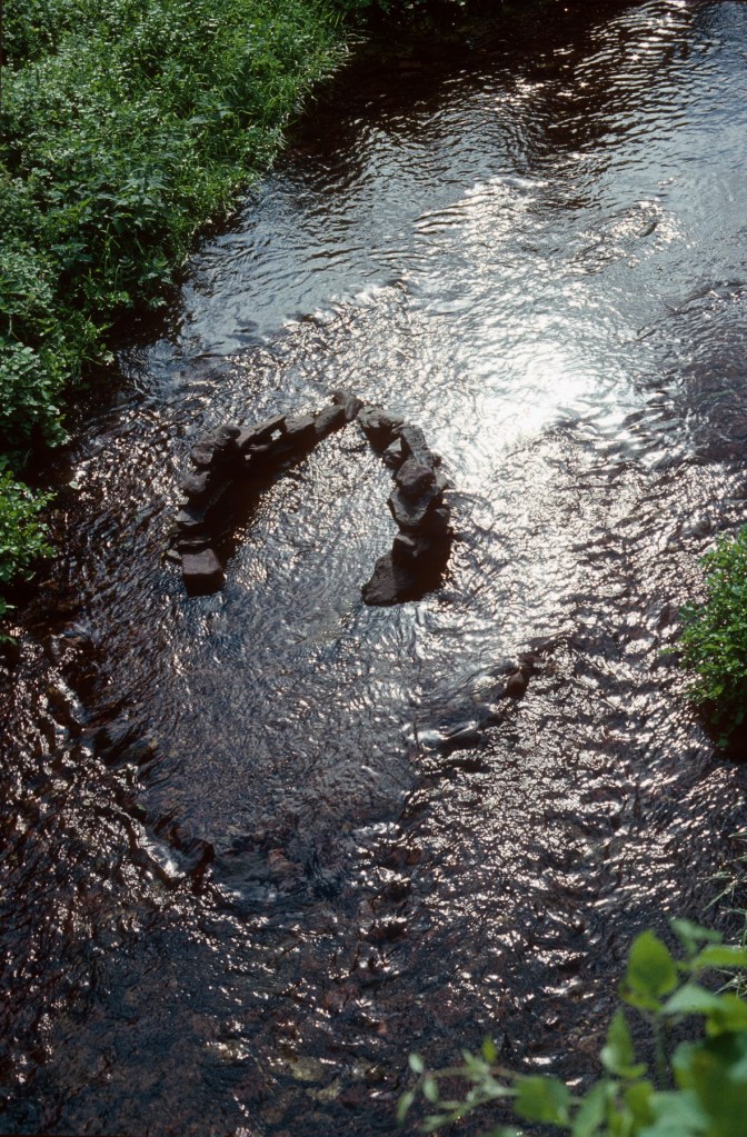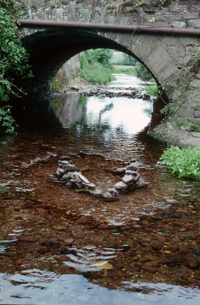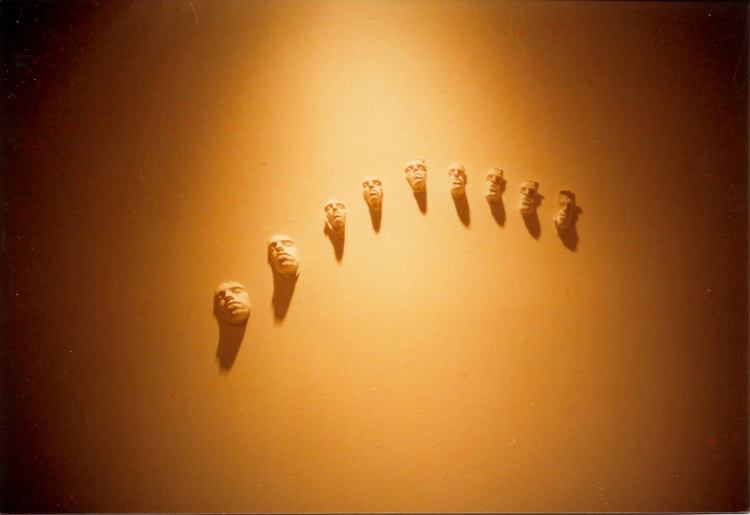 “River Stone Work 4 – view to bridge”, Eco-art installation, stones in river – Sculpting in the Decies, art residency, Sculptor’s Society of Ireland, Tallow, Co. Waterford, Ireland, 1991“Crown of Thorns” Eco-art installation – Millennium Project, Little Cataraqui Creek, KAAI Gallery (now Modern Fuel Artist-Run Centre), Kingston, Ontario 1992, 2000“Generations I, detail” Sculpture Installation, masks and books, 10′ x 12′ – Galerie 115, University of Ottawa, Ottawa, Canada, 1987“Generations II” Sculpture Installation, cast masks and books, 10′ x 18′ x 5′ – University of Ottawa, Ottawa, Canada, 1987