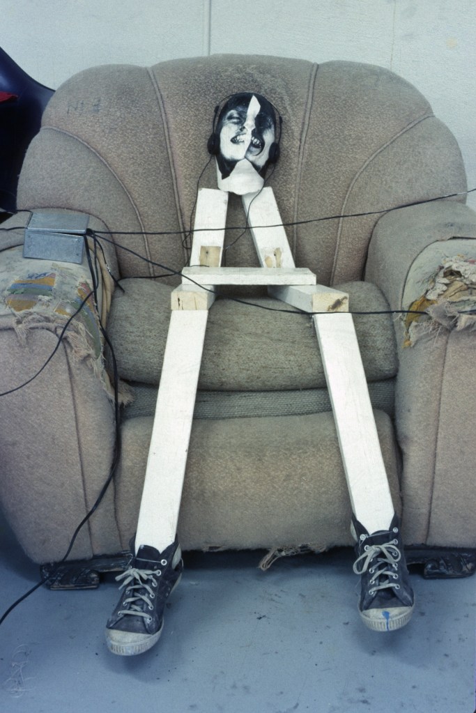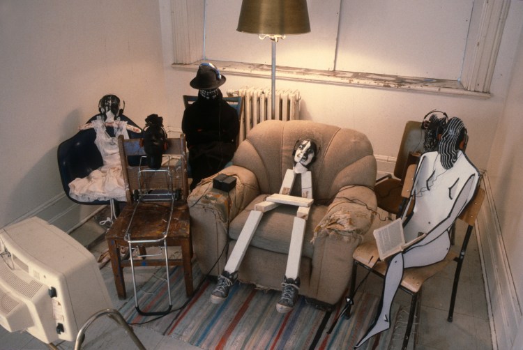 “River Stone Work 4 – view from bridge,” Eco-art installation, stones in river – Sculpting in the Decies, art residency, Sculptor’s Society of Ireland, Tallow, Co. Waterford, Ireland, 1991“Crown of Thorns, detail” Eco-art installation – Millennium Project, Little Cataraqui Creek, KAAI Gallery (now Modern Fuel Artist-Run Centre), Kingston, Ontario 1992, 2000“Why is this woman smiling?” Sculpture Installation, multimedia with masks – Galerie 115, University of Ottawa, Ottawa, Canada, 1987 “Why is this woman smiling? detail” Sculpture Installation, multimedia with masks – Galerie 115, University of Ottawa, Ottawa, 1987