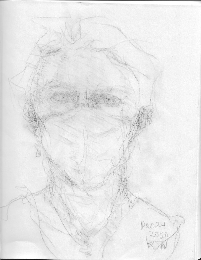Pencil drawing, “Covid Selfie, Left Handed” – 1 of 3000 international submissions, shown at #ArtGalleryofOntario (AGO) critically-acclaimed major art exhibition, “I AM HERE: Home Movies and Everyday Masterpieces, 2022 and part of digital collage/art exhibition, “Portraits of Resilience” 2020-present. Search under “Karen Joan Watson” – “I came in from outside and didn’t recognize the masked person in the mirror. I decided to explore who it was and capture her in a drawing. Using my left hand was a compassionate way to reduce my own expectations as an act of COVID caring.”
